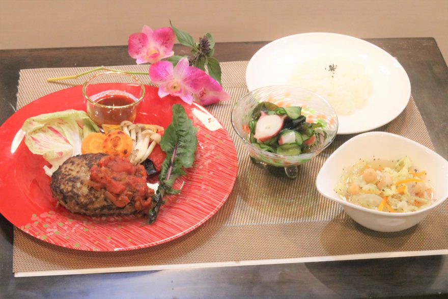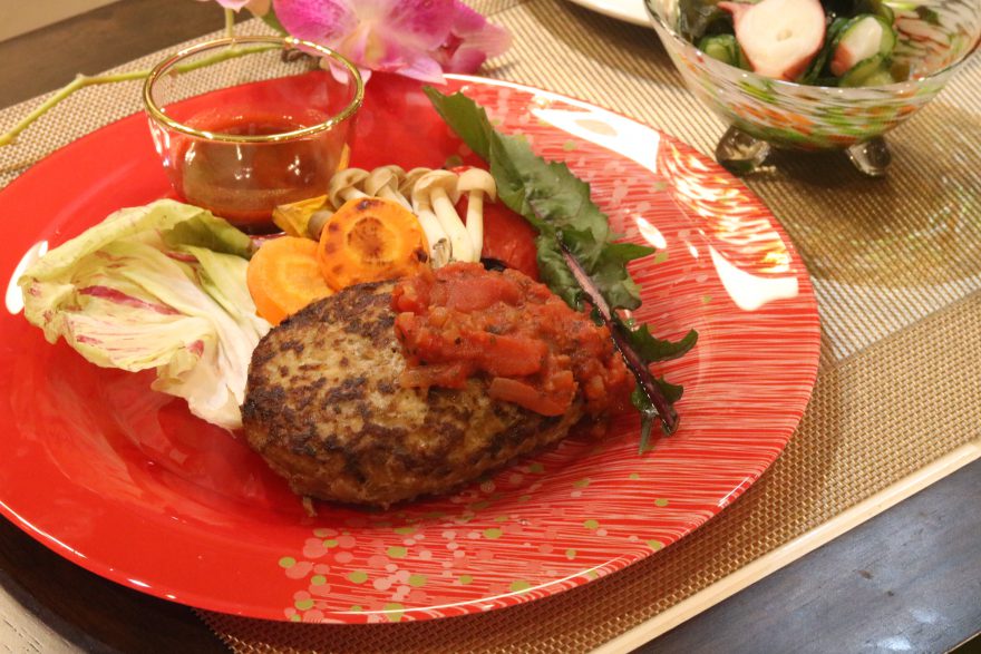 1週目はハンバーグ、たことわかめの酢の物、ベジ豆スープ